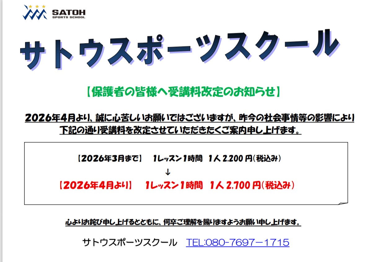 サトウスポーツスクールを開校して以来、5年間受講料を据え置きで頑張ってまいりました。